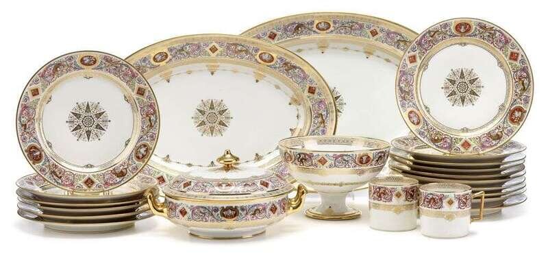 Comprising thirty-four dinner plates, two large oval platters, covered tureen, footed bowl, two dessert dishes, two mugs, two coffee cans, small creamer, five saucers, and ten demi-tasse saucers, all decorated in printed colors to show animals amongst scrolls, and a central gilt star motif in the center, blue overglaze interlaced LP marks, orange overglaze Chateau de F. Bleau mark, date code for 1846 and some with incised numbers to underside, one or two pieces with date code for 1909. (Approx 60).