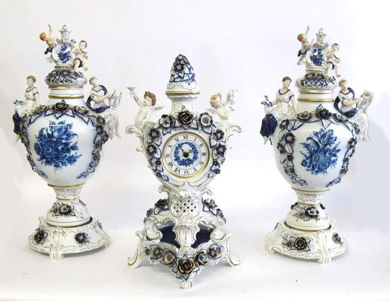 Dresden cobalt and gilt porcelain clock garniture 20th century