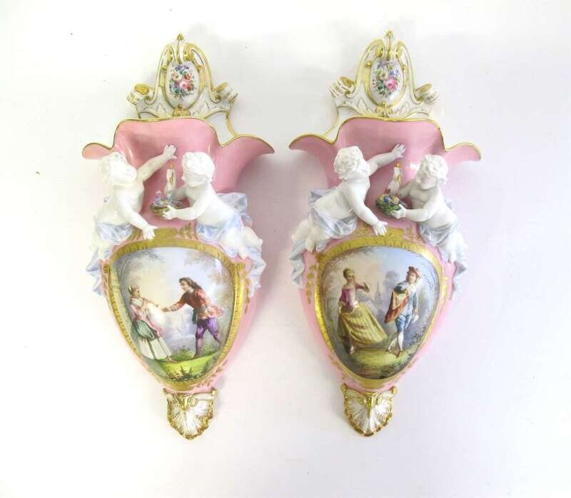 The top with cartouche of floral spray over shaped rim, the body modeled in relief with twin putti and bird's nest over painted vignette of lovers courting in romantic landscape against pink background, the backs impressed GR 564.