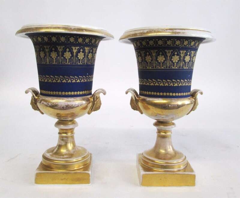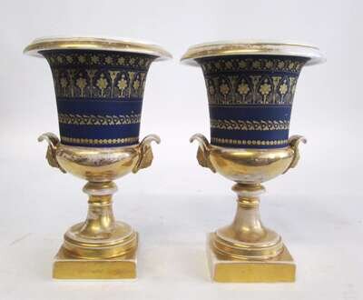 Pair of Paris porcelain gilt and cobalt painted urns 19th century
