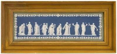 The white classical draped maidens against and blue ground, framed by a border of white foliage within a pale green border, impressed Wedgwood.