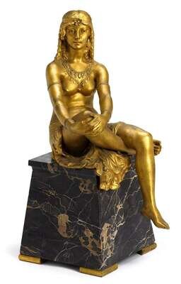 Gilt bronze, cast to show the semi-naked beauty signed "Th. Somme", sat upon a tapering square marble plinth incised to simulate stone blocks.