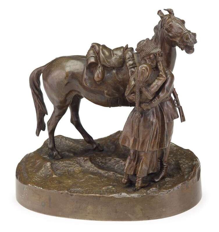 Bronze, mid-brown patina, depicting a solider, dismounted from his horse and in romantic embrace with his sweetheart on naturalistically cast oval base, marked Grachev in cyrillic, and FABR. C.R. WOERFFEL, ST. PETERSBURG.