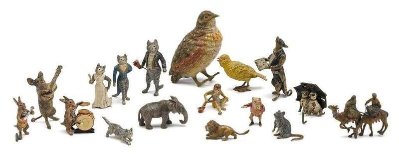 Approximately eighty-five, including a bronze pheasant by Jules Mene, birds by Franz Bergman, cats, dogs, frogs, fox, horses, group of hounds with stag, barnyard animals, etc. several marked.
