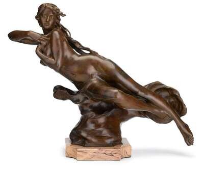Bronze, mid-brown patina, the nude female figure clutching her breast, her hair long and flowing as if in mid-flight, above shaped marble base.