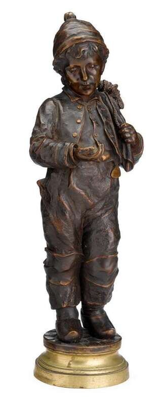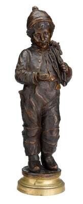 Bronze, mid-brown patina, depicting a peasant boy with satchel, raised on socle base.