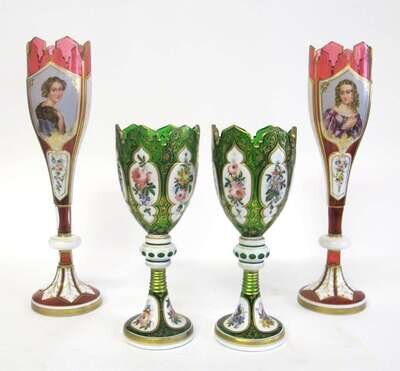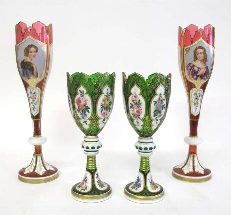 Including two pairs, both goblet form: one pair in white glass cut to emerald with gilt-painted foliate scrolls, the body with arabesques painted with floral vignettes, against a white ground, the flaring base similarly painted; the other pair in white cut to ruby, the body gilt painted with full-length leaves and a central shielf-form panel with portraits of ladies.