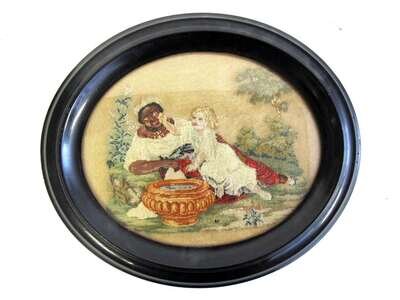 Depicting young girl with her attendant in a garden, against metallic background, in ebonized oval frame.