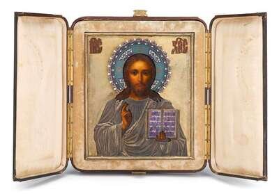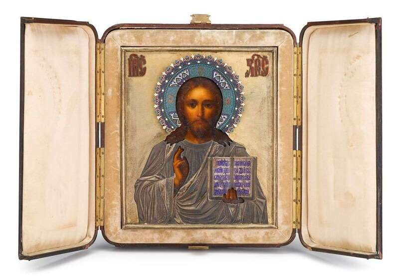 Russian guilloché, champlevé, and cloisonné enameled silver-gilt icon of the Lord Almighty ivan tarabrov, moscow, circa 1900, retailed by fabergé