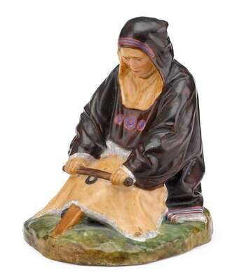 Depicting a woman in traditional costume, working a hide, the underside with green Imperial Porcelain factory mark and illegible date, incised Cyrillic marks.