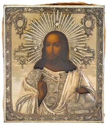 The painted wood panel overlaid with repoussé and engraved silver-gilt riza with Christ in elaborate floral decorated robe, his right hand resting on an orb, framed overall by a foliate border, each corner depicting cornucopia and floral-filled basket.