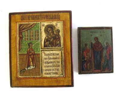 Both of rectangular form, painted with religious scenes, and cyrillic text.