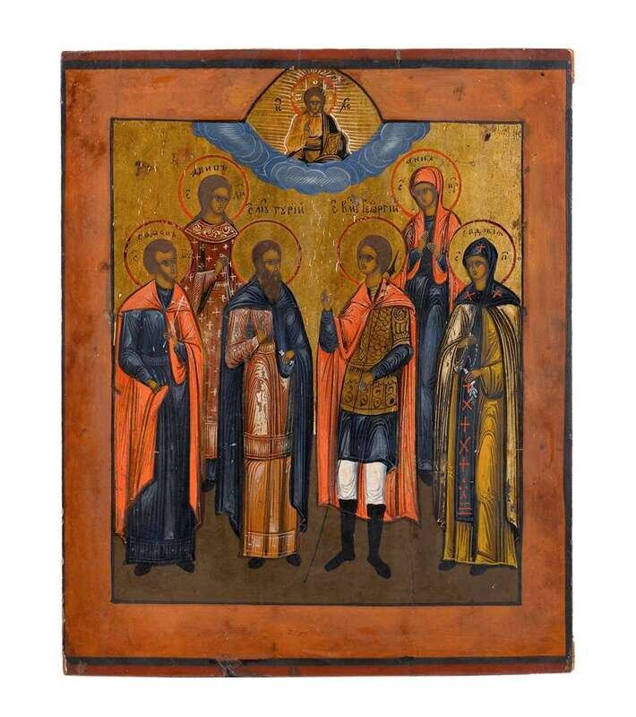Polychrome painted to depict various saints including St. George, Anne and Simeone, against a maroon and gilt background.