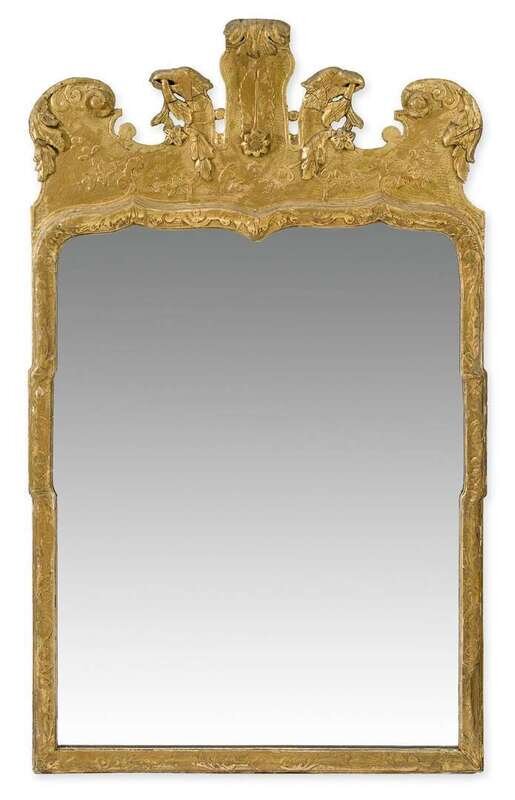 The rectangular mirror plate with arched top enclosed within a molded frame, the top with broken arch pediment, the acanthus plume finial flanked by two eagle's heads.