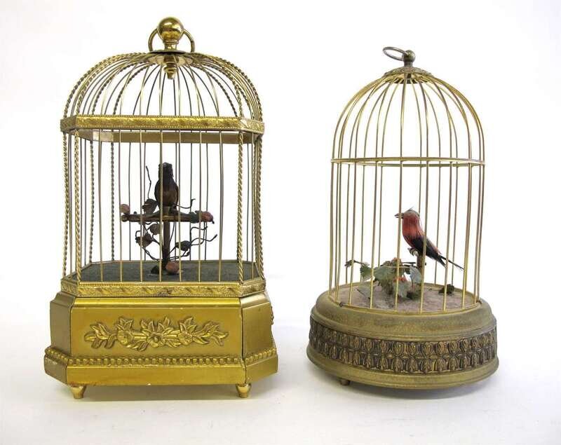 Both enclosed in wire cages with wind-up chirping figures. One stamped "German" the other "Made in West Germany".
