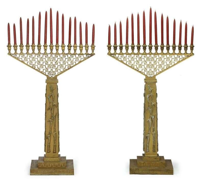 The inverted triangular candle support issuing nine floriform candlecups above square pinth with cast bamboo detail in relief, and stepped base.
