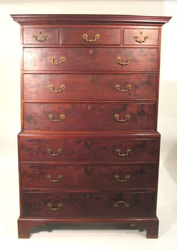 In two sections: the upper section with molded over-hang cornice above three short and three long drawers, the lower section with three long drawers raised on bracket feet.