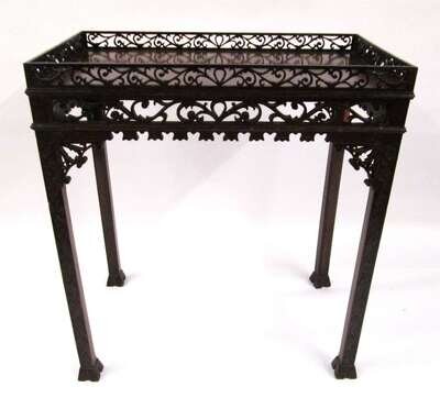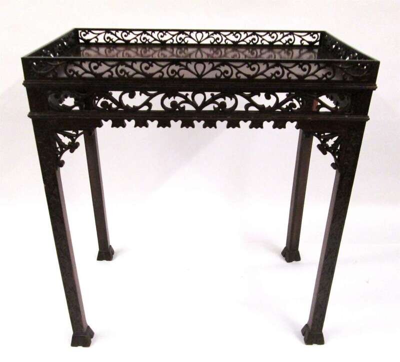 The rectangular top with fretwork carved gallery above fretwork carved frieze, supported on square carved legs and marlborough feet.
