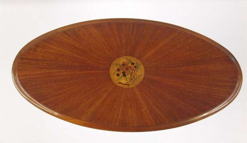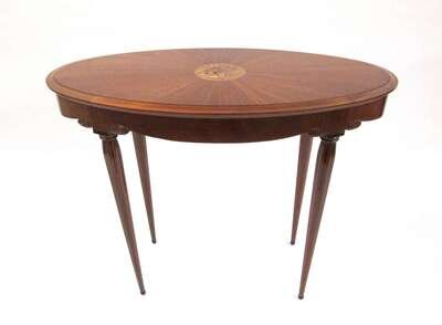 The oval top with thumbnail molded edge, centered by a circular marquetry panel of berries and leaves, above shaped skirt, the octagonal ebony line-inlaid legs with twin scroll carving at knee, tapering to acorn feet, branded twice ECOLE BOULLE PARIS.