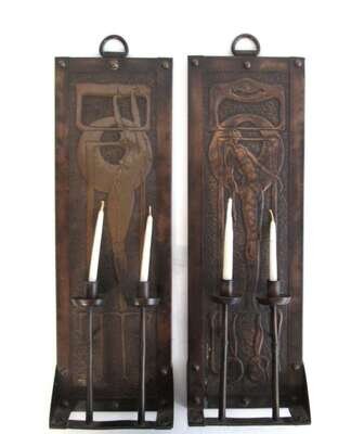 The rectangular backplate featuring a repoussé design of a nude woman against a hammered backdrop within a riveted frame supporting two upright candlearms, the back signed in Japanese characters.