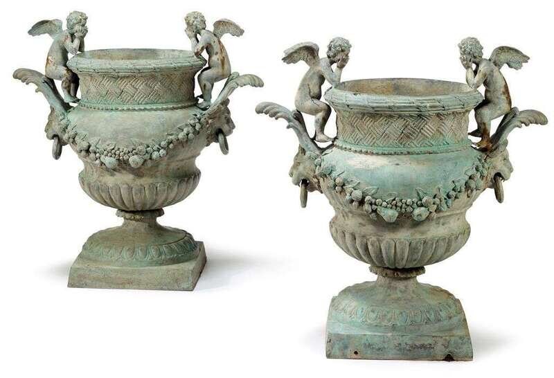 Campana-form, the top modeled with basket-weave design, flanked by twin angels on leaf-form seats, above two lion's mask with ring handles issuing swags of buds and pears, reeded basin above egg and dart molded collar and socle, terminating in square plinth.