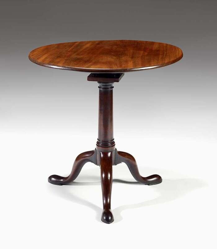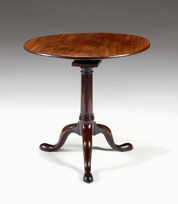 The circular tilt top over a tapering column support, raised on outswept tripod legs terminating on pad feet.