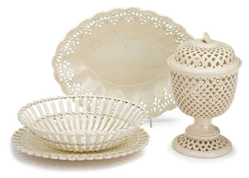 Including Neale basket and undertray, lidded potpourri dish, and feathered-edge oblong serving dish. (3).