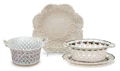 Including salt-glaze stoneware plate, double-handled porcelain dish, and oblong Stevenson creamware basket and undertray bearing impressed Stevenson and ship marks. (3).