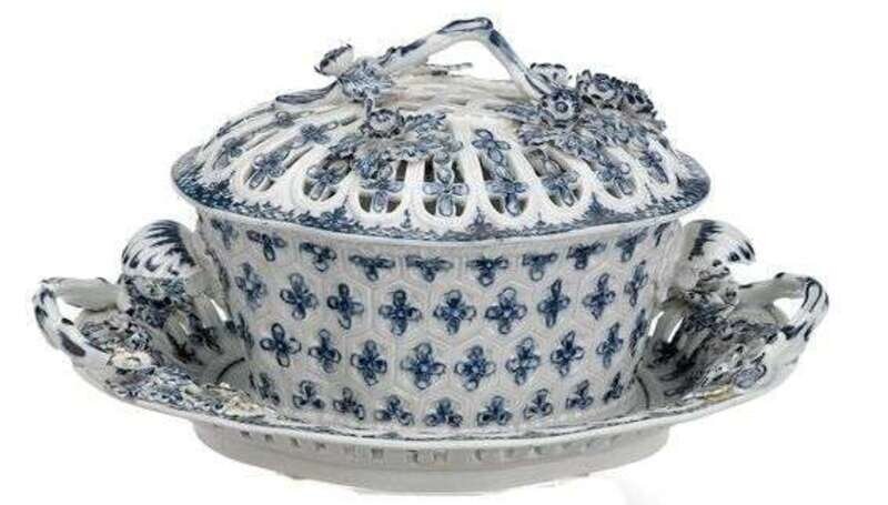 The shaped tureen with reticulated latticework and floral lid with patterned rim and twig handle ending in floral bough terminals, tureen body with molded with repeated hexagonally framed flowers and two rocaille handles, the center painted with pinecones and foliage, the underplate similarly decorated the tureen and underplate with blue crescent mark to underside.