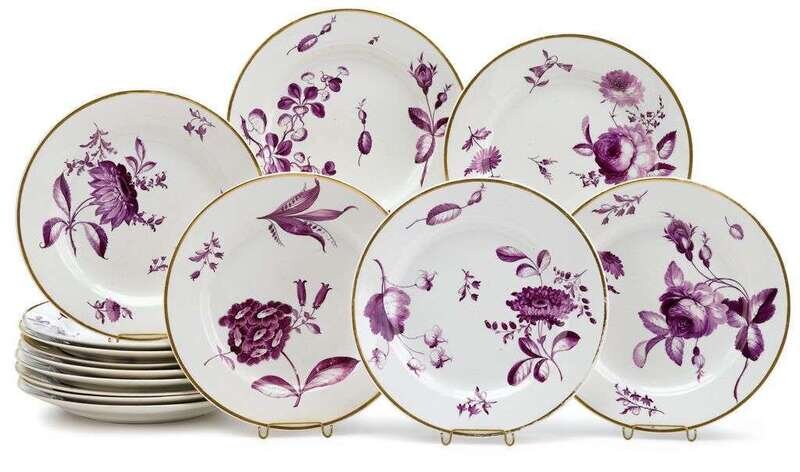 Of circular form hand-painted with purple botanical specimens and gilt rim, red overglaze crown over crossed swords mark and pattern number 21 to underside. (28).