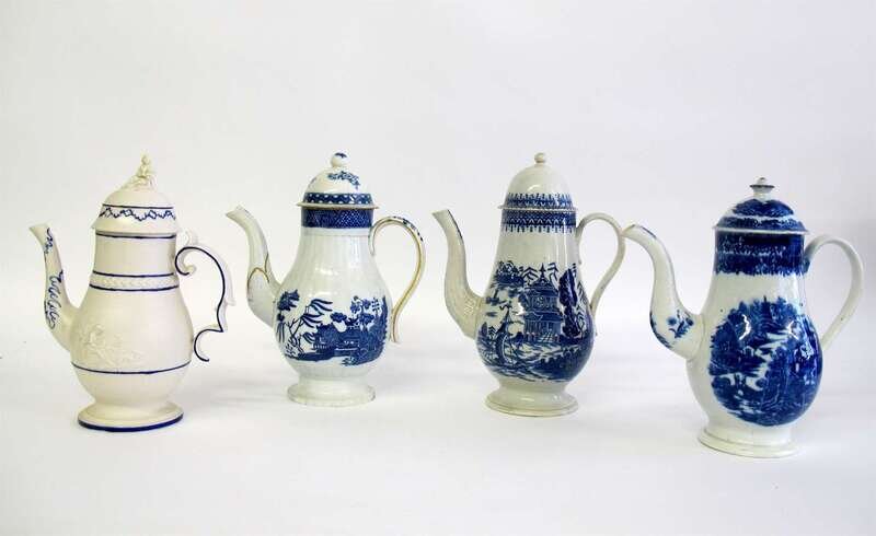 Four English blue and white coffee pots circa 1800, probably worcester and chetham & woolley