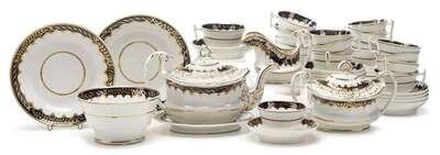 Comprising a teapot with underplate, sugar, creamer, eighteen teacups and saucers, bowl, and two dishes, all gilt decorated with floral swags over a cobalt border, underside marked with painted red decorator's numbers. (43).