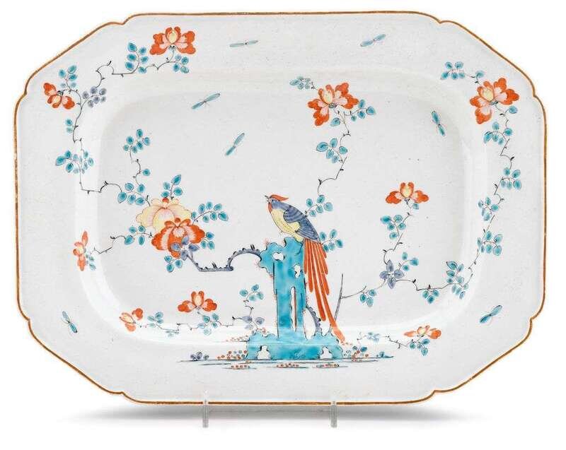 Of rectangular form with shaped corners, polychrome painted in the Japanese Kakiemon style with perched bird in floral landscape.