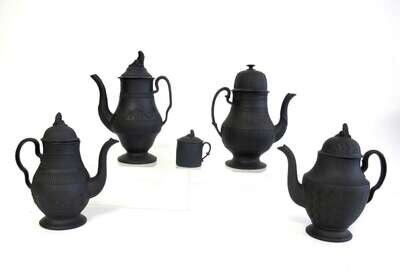 Pear-shaped with engine turned geometric designs and applied neoclassical sprigs; together with lidded cup. (5).