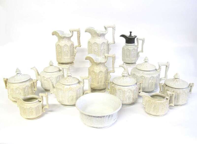 Including four teapots, three pitchers, two sugars, two creamers, syrup jug, and bowl, all molded with gothic arches and apostle figures. (13).
