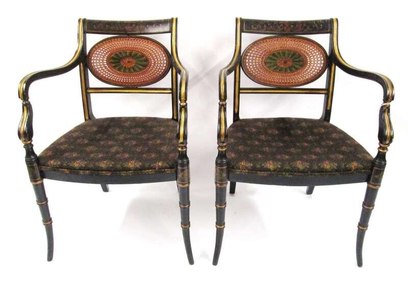 Pair of Regency style gilt decorated ebonised armchairs early 20th century