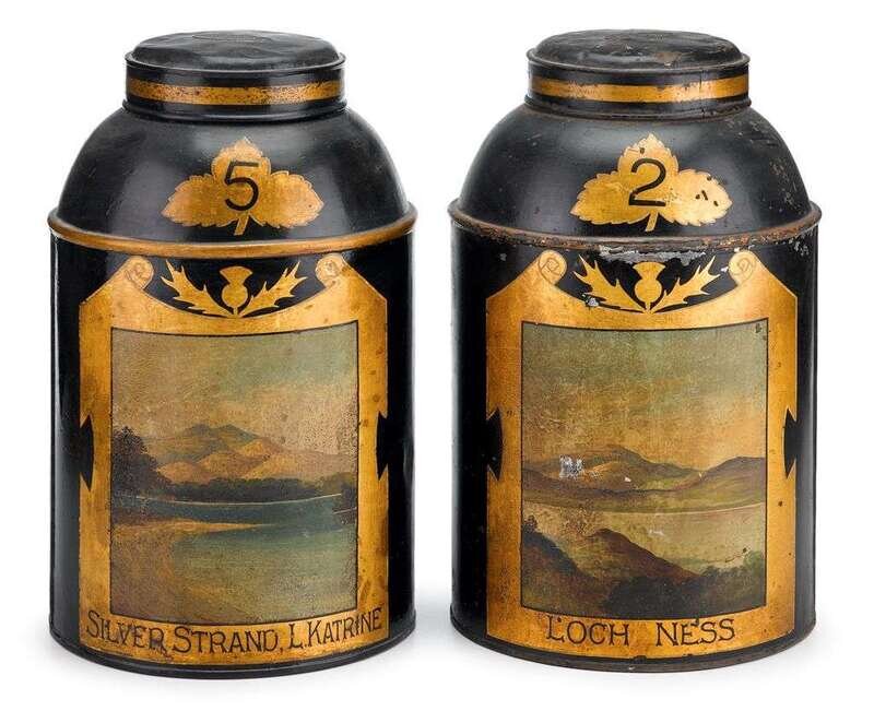 Two Scottish gilt and polychrome painted Toleware canisters circa 1870, labeled scottish cooperative