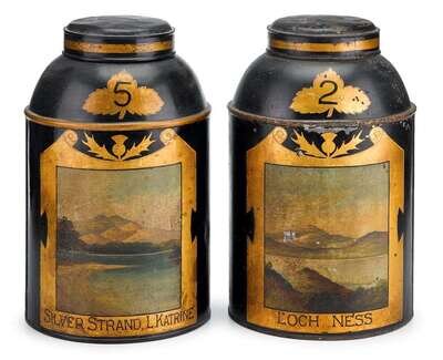 The cylindrical canisters with domed lids labeled "Scottish Co-operative, Made at Shieldhall, Wholesale Society", one decorated with a scene of Loch Ness, the other of Silver Strand, Loch Katrine.