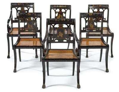Set of six Regency style black lacquered chinoiserie klismos chairs two circa 1810, the others of modern construction en suite