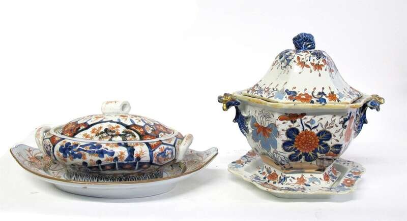 Two of domed hexagonal form by Mason, one in the Imari palette, the other in underglaze blue chinoiserie decoration; a Japanese Imari porcelain oval-form lidded tureen, a Spode Imari pattern underplate, and an English lidded ironstone partitioned dish in underglaze blue. (6).