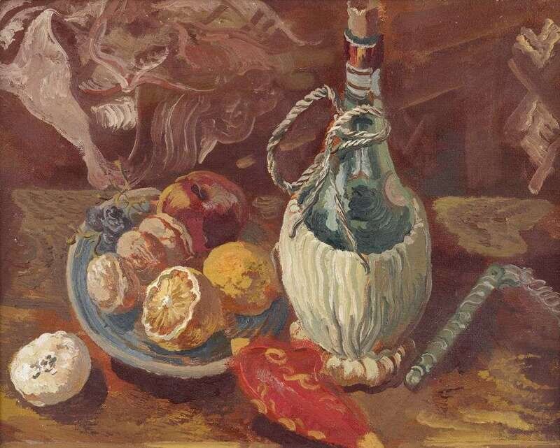 GEORGE GROSZ (GERMAN, 1893-1959) "STILL LIFE WITH CHIANTI BOTTLE, FRUIT BOWL AND OCARINA"