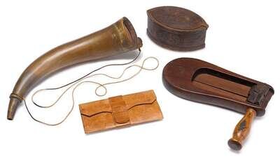 Including an oval, chip-carved box decorated with flowerheads, banding and the initial "B" enclosed in a coiling snake reserve, incised, "April 19, 1781" on underside; a watchman's rattle branded, "W.R."; a gentleman's folding leather wallet embossed with eagles on urns and landscape with Mt. Vernon; and a powderhorn with handwritten inscription "Samuel Capen's horn 1785."