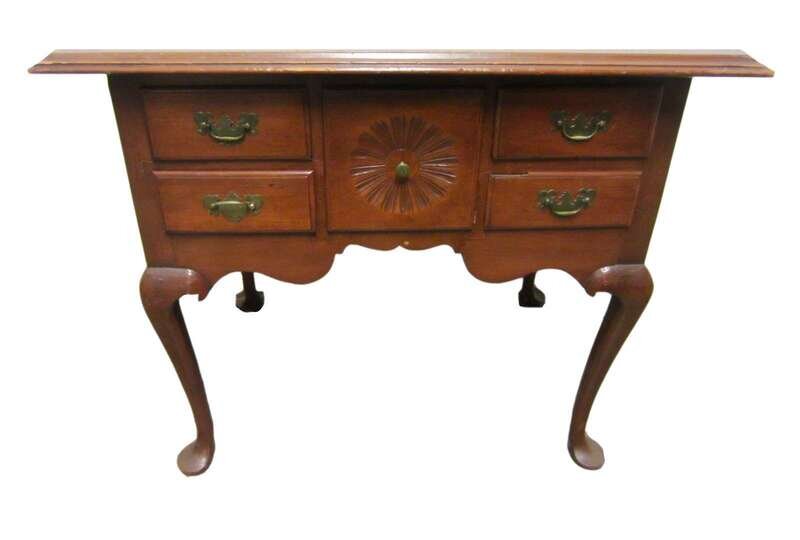 Rectangular top above arrangement of five drawers, the center drawer carved with sunburst, shaped apron on cabriole legs ending in pad feet.