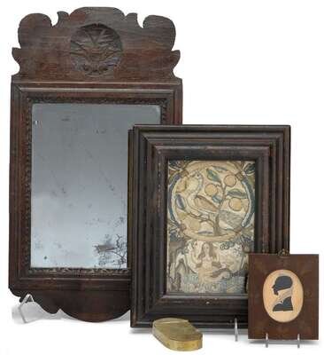 Including a Chippendale mirror with shaped cresting carved with a shell; an English stumpwork embroidery depicting peacock in tree and mermaid, worked in a variety of stitches, framed; an oval brass snuff box engraved with a full- length figure of "Old Q"--The Duke of Queensbury; and a hollow-cut silhouette of a gentleman, heightened with paint, framed.