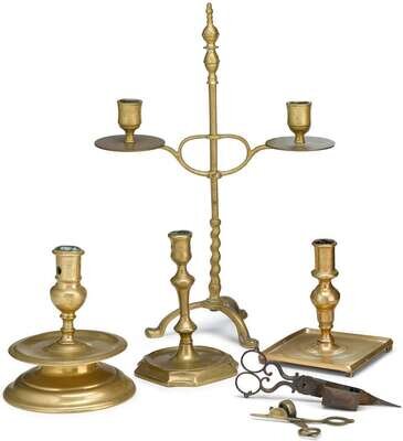 The first, of baluster form on a squared base; the second, of baluster form on an octagonal base; the third, of baluster form on a trumpet base; and the fourth, an adjustable double candlearm on support with turned finial on a tripod base; together with a small brass scissor form snuffer and a steel scissor form candle snuffer.