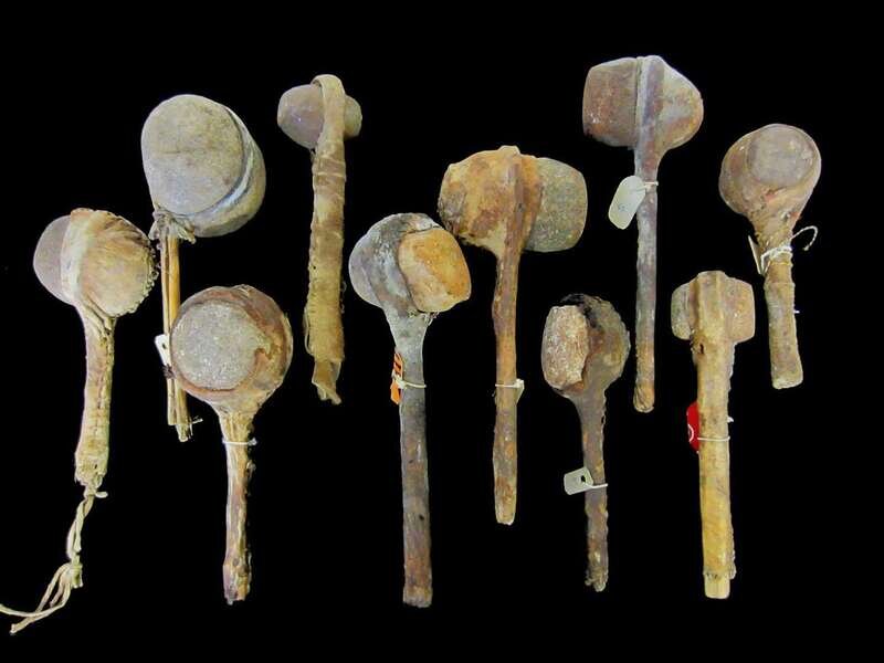 Each with a stone attached to wooden handle by hide strapping or enclosed in hide.