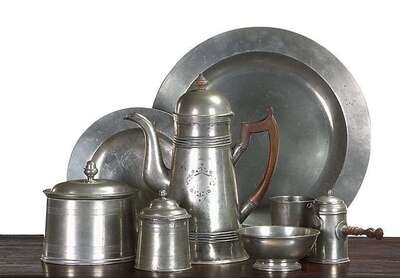 Including a lighthouse form coffee pot with bright-cut reserve enclosing "Wheeler 1829," attributed to Israel Trask (1813-1856), Beverly, Massachusetts; a covered oval box, Rufus Dunham (1837-1861), Westbrook, Maine; a small bowl; a small hot water jug with carved side handle, engraved "M.E.M 1792"; a cup, a charger and a plate with rubbed marks.