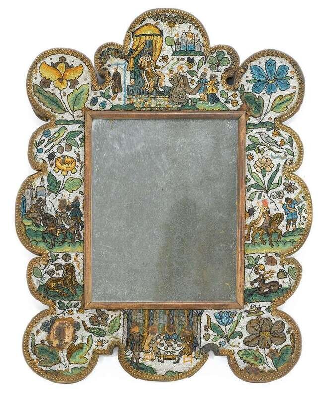 Scalloped beaded frame worked with animals, figures and flowers enclosing a rectangular mirror plate, edged with beaded metal banding.