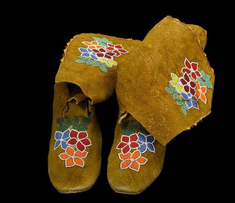 Pair of Prairie women's hide beaded moccasins first half 20th century