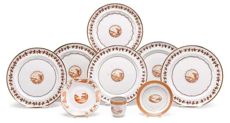 Comprising four teabowls and saucers with pale pink inner rim, central scene of house nestled in landscape; six plates with leaf and grape outer border and central roundel filled with mountainous landscape with turret and bridge; a tea cup and saucer with wide sepia and gilt banding and harbor scene cartouche; and a small plate with a central landscape view and an outer band of alternating landscape vignettes and precious objects.